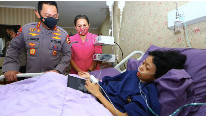 “Dik Sinta. Sekarang sudah ada Pak Kapolri. Tetep semangat ya. Nanti di kasih obat, di minum ya,” kata Sigit saat menjenguk Sinta Aulia di kamar perawatan RS Polri, Kramat Jati.