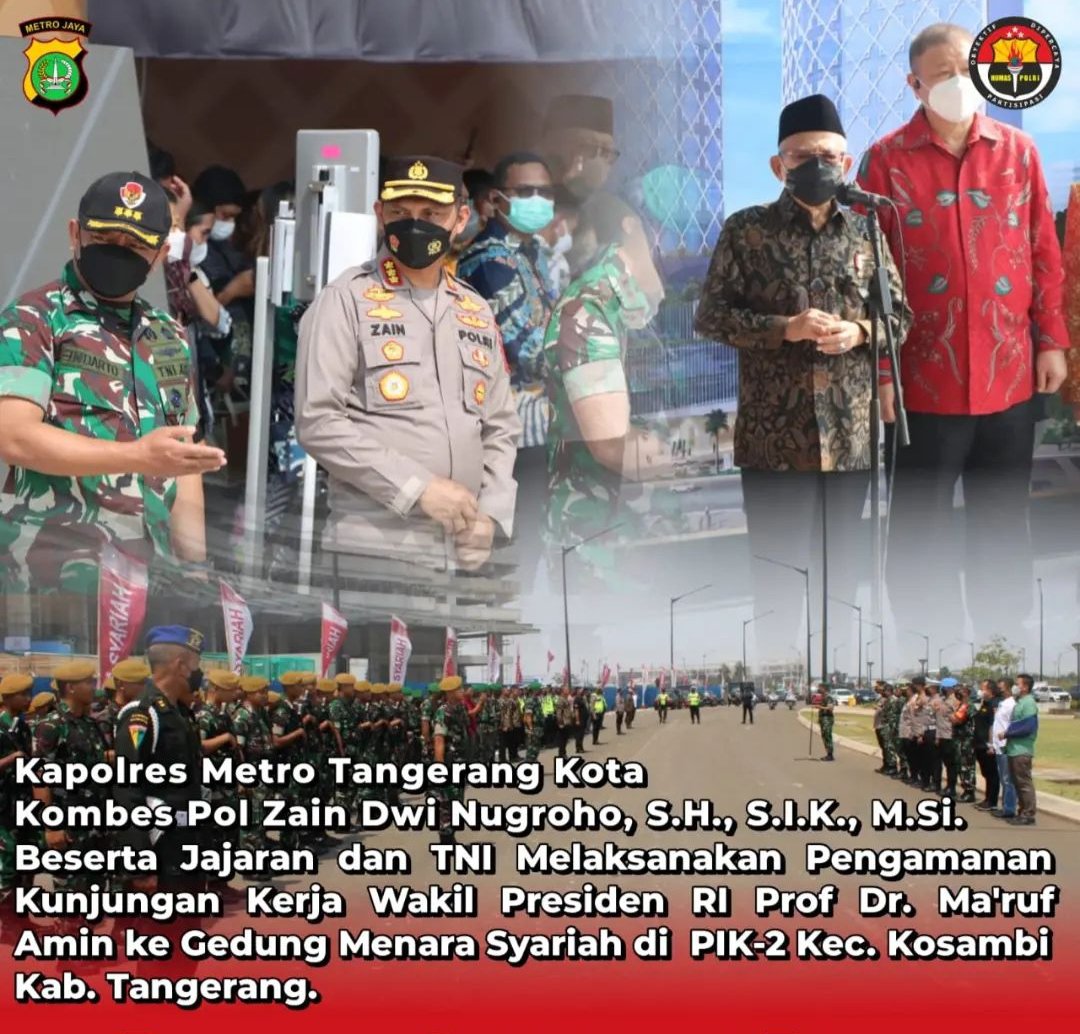“Kunjungan kerja Wakil Presiden RI Bpk. Prof Dr. KH. Ma’ruf Amin hari ini, dalam rangka meresmikan Topping Off Menara Syariah di Jl. Pangeran Antasari Unit CBD – 21, Pantai Indah Kapuk (PIK) 2, Kabupaten Tangerang, Banten, ucap Kapolres.