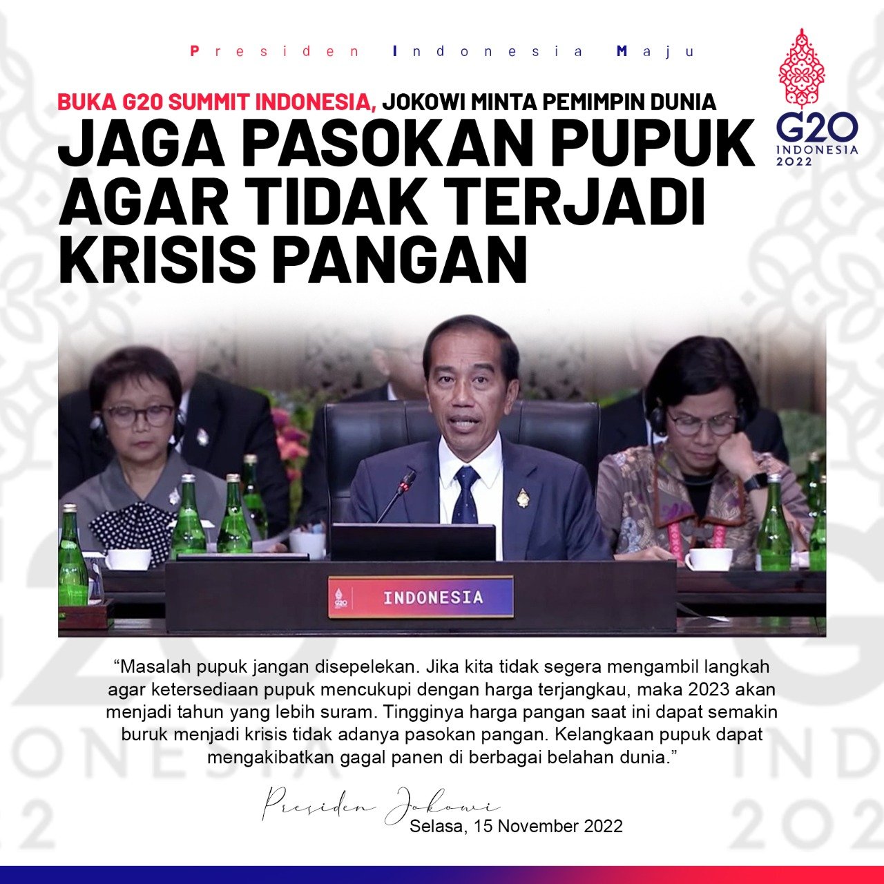 Saat membuka KTT G20 di Bali, Presiden Jokowi mengetuk hati 17 kepala negara dan pimpinan lembaga internasional agar melepas ego demi meraih solusi. Kelangkaan pupuk perlu pemecahan, karena bisa memicu krisis pangan.