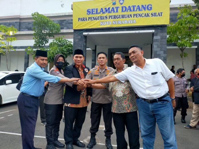 Polrestabes Surabaya menggandeng 35 pimpinan perguruan pencak silat di Kota Pahlawan untuk menggelar forum grup diskusi bertema ‘Pendekar Wani Jogo Suroboyo’. Kegiatan yang digelar dalam upaya menjaga kondusivitas dan meminimalisir gesekan antar perguruan silat di Surabaya ini digelar di Gedung Bharadaksa, Mapolrestabes Surabaya, Jumat (18/11/2022).