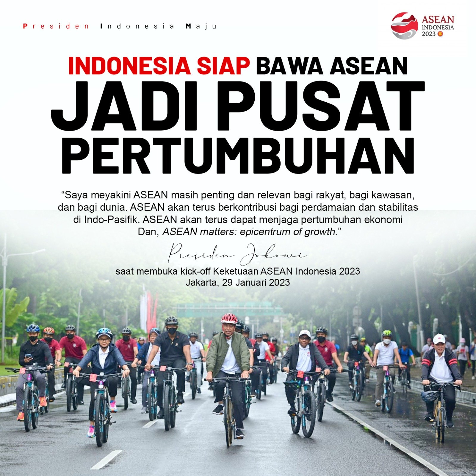 Memegang ketetuaan ASEAN 2023, Presiden Joko Widodo (Jokowi) menyampaikan, Indonesia siap menjadikan ASEAN sebagai pusat pertumbuhan. Jokowi meyakini ASEAN masih memiliki peran penting dan relevan bagi rakyat, baik di kawasan maupun di dunia.