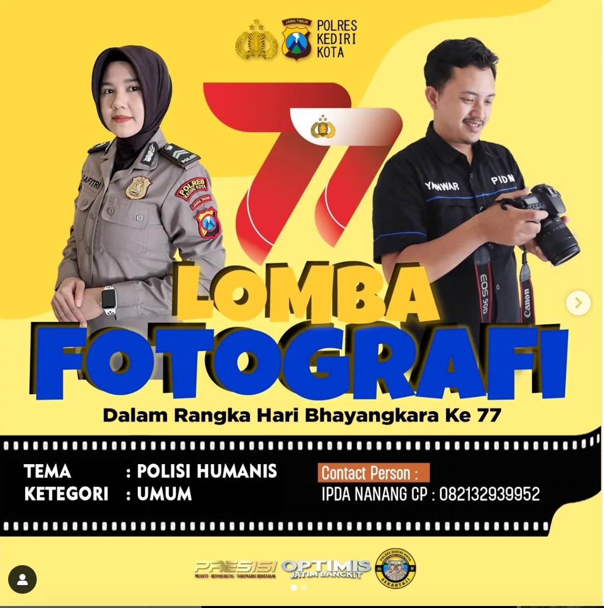 KEDIRI,Kepolisian Resor Kediri Kota, Dalam rangka memperingati Hari Ulang Tahun Bhayangkara ke 77 mengadakan lomba Fotografi dengan tema Polisi Humas, adapun lomba terbuka untuk anggota dan masyarakat umum, Juni 2023.