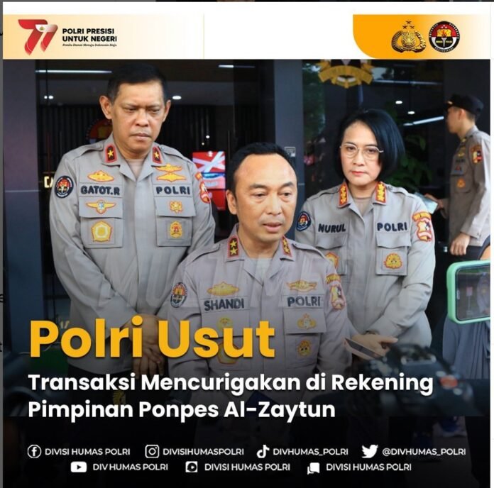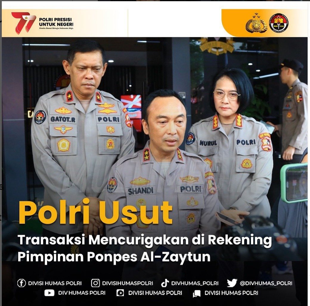 Bareskrim Polri membentuk tim untuk mengusut transaksi mencurigakan dari 256 rekening milik pimpinan Pondok Pesantren Al-Zaytun, Panji Gumilang. “Itu menjadi bagian dari tugas dari Bareskrim Polri. Ada tim yang dibentuk bagi tugasnya masing masing siapa yang harus koordinasi dengan PPATK (Pusat Pelaporan dan Analisis Transaksi Keuangan), mencari saksi ahli, serta melengkapi kebutuhan penyidik lainnya,” ujar Kepala Divisi Humas Polri Irjen Pol. Dr. Sandi Nugroho, S.I.K., S.H., M.Hum., di halaman Divisi Humas Polri, Jakarta Selatan, Jumat (7/7).