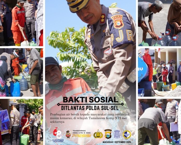 Satuan Tugas Patroli Jalan Raya (Sat PJR) Ditlantas Polda Sulawesi Selatan (Sulsel), Kamis, 31 Agustus 2023 melaksanakan pengabdian bakti sosial berupa pemberian air bersih kepada masyarakat yang terdampak kekeringan di kompleks NTI dan sekitarnya di kecamatan Tamalanrea kota Makassar Sulsel.