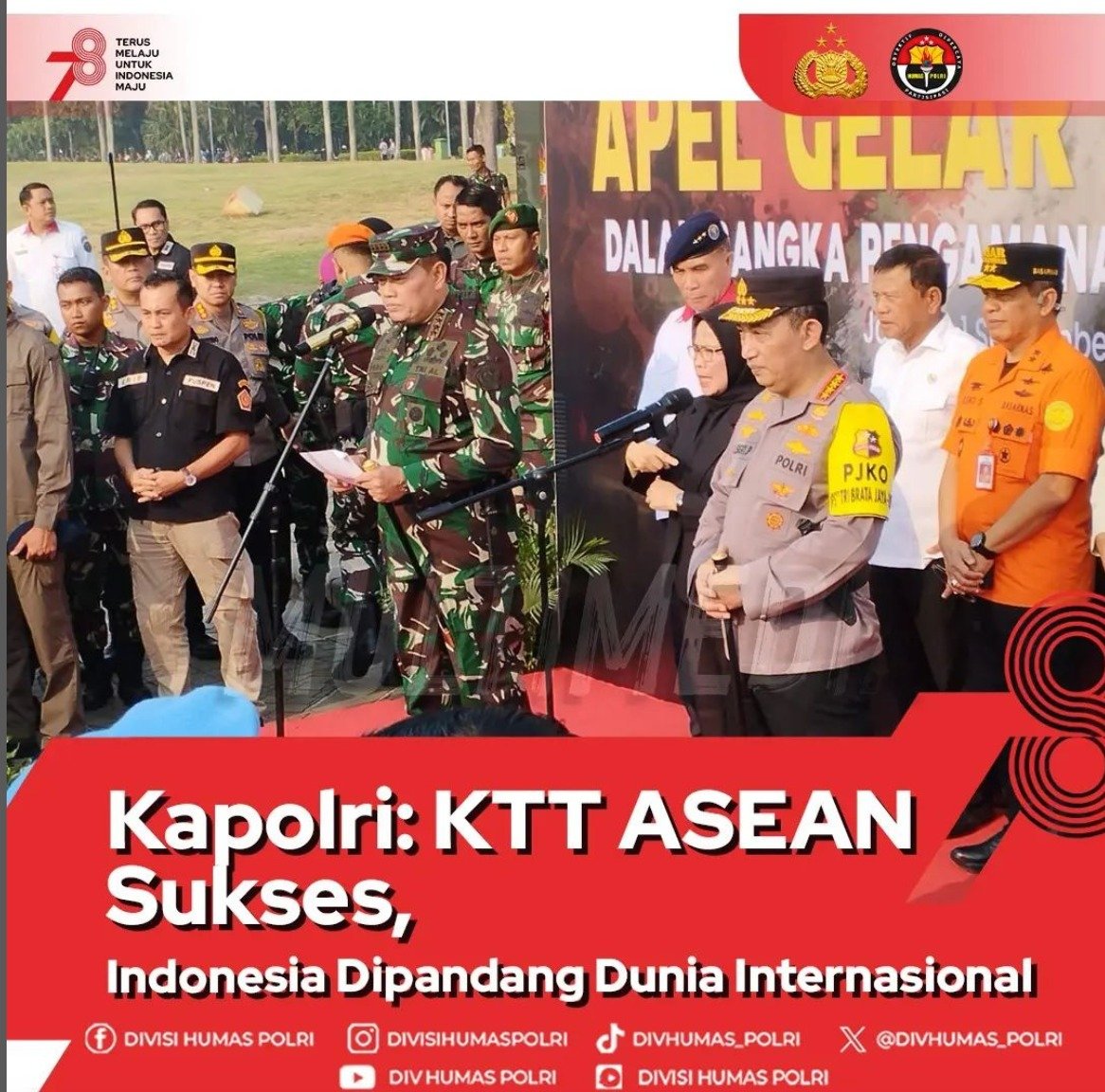 Dalam pengamanan, Polri akan bersinergi dengan TNI dan instansi terkait. “Kegiatan ini menjadi event yang sangat penting yang harus sukses, aman dan lancar sehingga event KTT ASEAN betul-betul bisa menjaga dan menjadikan Indonesia sebagai negara yang dipandang di ASEAN,” jelas Kapolri di Lapangan Silang Monas, Jakarta Pusat, Jumat (1/9).