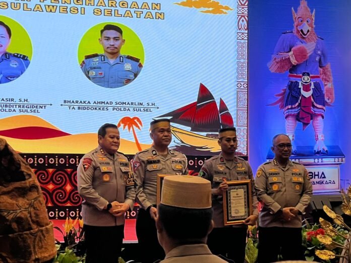 Polda Sulawesi Selatan memberikan penghargaan kepada dua personilnya, pada acara Rakorbin SDM dan PNS Polri Tahun 2023 Polda Sulsel yang dilaksanakan di Dalton Hotel Makassar, pada hari ini, Kamis (30/11)