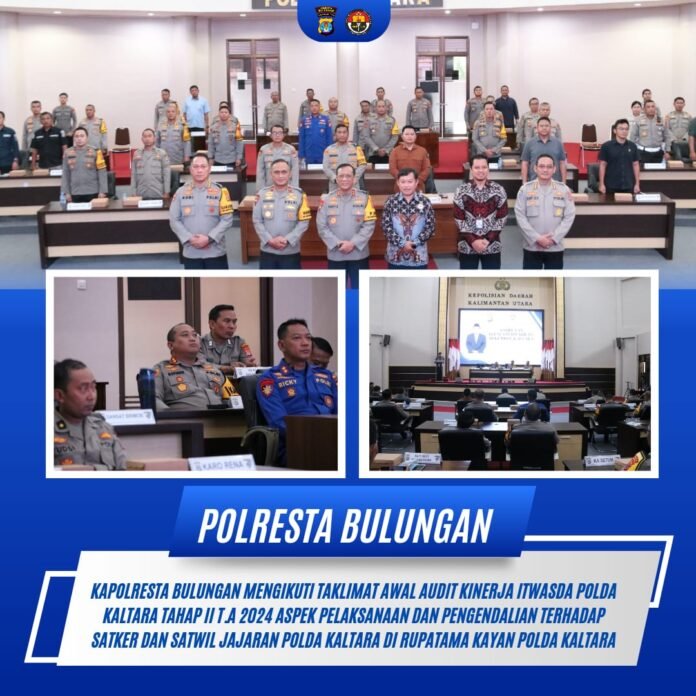 TANJUNG SELOR, Polda Kaltara – Kapolresta Bulungan, AKBP Rofikoh Yunianto, S.I.K., menghadiri kegiatan Taklimat Awal Audit Kinerja Itwasda Polda Kaltara tahap II T.A 2024. Acara tersebut, yang berfokus pada Aspek Pelaksanaan dan Pengendalian di jajaran Polda Kaltara, berlangsung di Ruang Rupatama Kayan, Polda Kalimantan Utara, pada Kamis (10/10/2024).