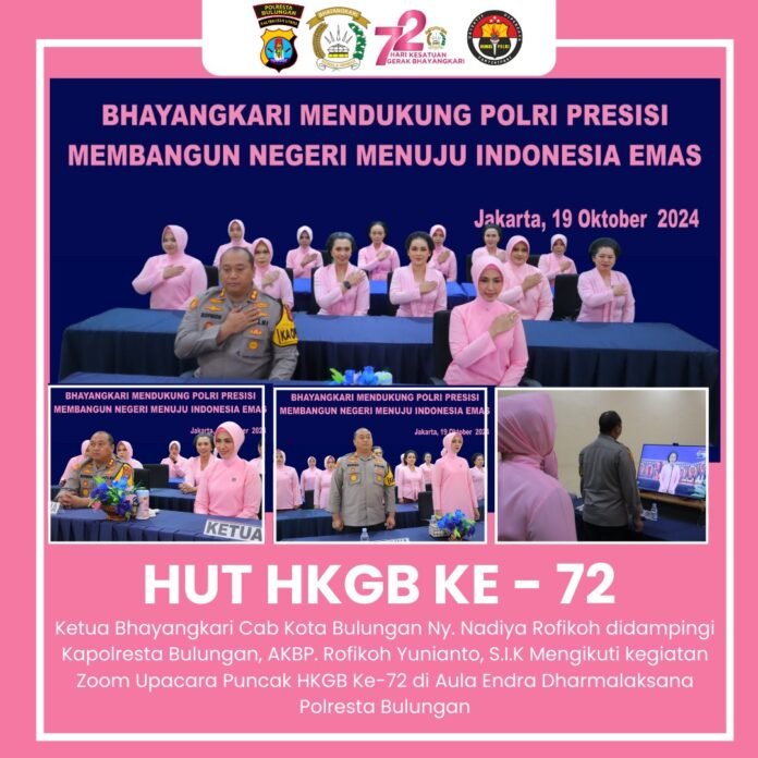 TANJUNG SELOR, Polda Kaltara, Polresta Bulungan – Kapolresta Bulungan, AKBP Rofikoh Yunianto, S.I.K., mengikuti acara puncak peringatan Hari Kesatuan Gerak Bhayangkari (HKGB) ke-72 melalui Zoom meeting pada Sabtu, 19 Oktober 2024.