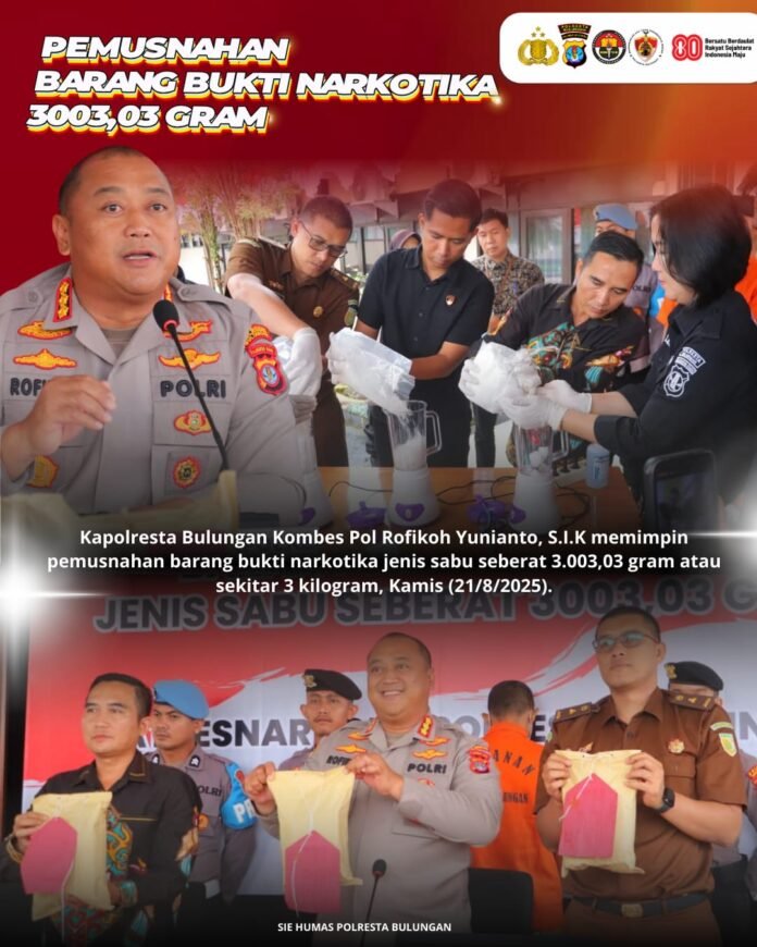TANJUNG SELOR, Polda Kaltara, Polresta Bulungan – Satuan Reserse Narkoba (Satresnarkoba) Polresta Bulungan melaksanakan pemusnahan barang bukti narkotika jenis sabu seberat 3.003,03 gram atau sekitar 3 kilogram, Kamis (21/8/2025).