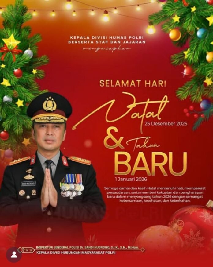 Jakarta — Kepala Divisi Humas Polri Irjen Pol. Sandi Nugroho, menyampaikan ucapan Selamat Hari Natal 25 Desember 2025 dan Tahun Baru 1 Januari 2026 kepada seluruh masyarakat Indonesia.