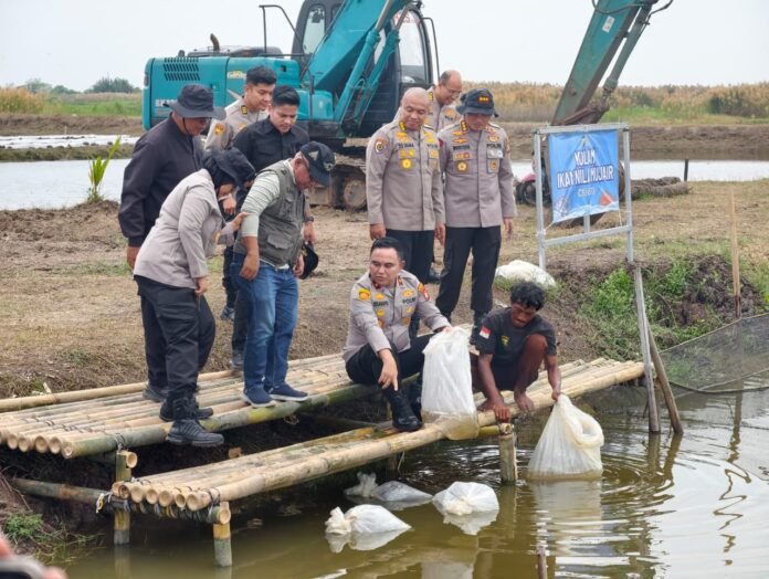 Bekasi — Wakapolda Metro Jaya Brigjen Pol. Dekananto Eko Purwono meninjau sekaligus memimpin penebaran benih ikan tahap kedua di tambak Muara Gembong, Kabupaten Bekasi, Sabtu (18/4/2026). Kegiatan ini merupakan bagian dari penguatan rantai pasok bahan baku SPPG Polda Metro Jaya.